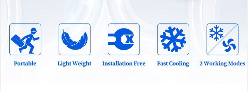 Ovaj prijenosni klima uređaj posebno je dizajniran za korištenje u automobilu i kampiranju na otvorenom. Može raditi s baterijom, puniti se u automobilu ili koristiti pretvarač za rad s izmjeničnom strujom.